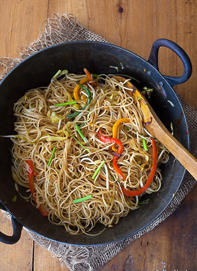 রাইস নুডলস ৫০০ গ্রাম মুরগি বা গরুর মাংস সিদ্ধ ২০০ গ্রাম সয়াবিন তেল প্রয়োজন মত বাঁধাকপি কুচি ২ কাপ পেঁয়াজ কুচি ১/৪ কাপ সয়াসস (লাইট) ৩ টে. চা. রসুন ছেঁচা ১ টে. চা. সাদা গোলমরিচ ১/৪ চা. চা. আদা ঝুরি ২ চা. চা. বরবটি/পিঁয়াজ পাতা ১০০ গ্রাম চিংড়ি সিদ্ধ ১০০ গ্রাম কচি পেঁয়াজ ঝুরি (ইচ্ছা) ধনেপাতা কুচি ক্যাপ্সিকাম, গাজর- ইচ্ছা লবণ- স্বাদ মত টেস্টিং সল্ট- স্বাদমতপ্রণালী-