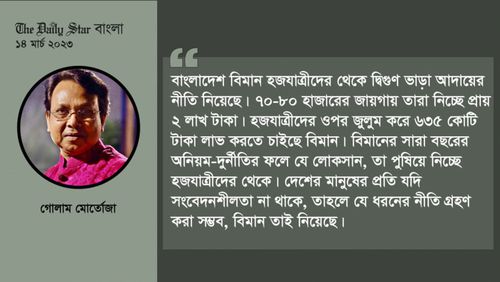 এই ভাড়া বৃদ্ধির কারণ হিসেবে বিমান যে দাবি করছে, তা অদ্ভুত। তারা বলছে, যে উড়োজাহাজ হজযাত্রী নিয়ে সৌদি আরবে যাবে, ফেরার সময় প্রায় খালি ফিরবে। তাই খালি ফ্লাইট নিয়ে ফেরার লোকসানটা হজযাত্রীদের ওপর চাপিয়ে দিচ্ছে বিমান।