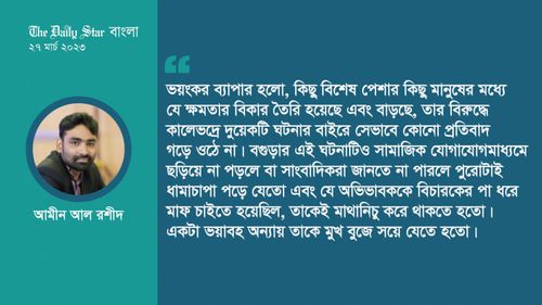 ঘটনাটির আরও তদন্ত হবে কি না এবং তদন্তে ওই বিচারক দোষী প্রমাণিত হলে তার বিরুদ্ধে শাস্তিমূলক ব্যবস্থা নেওয়া হবে কি না, সেটি ভবিষ্যতই বলে দেবে। কিন্তু তার যে মেয়েটিকে এরকম একটি বাজে অভিজ্ঞতার মধ্য দিয়ে যেতে হলো; যার সামনে একটি সুন্দর ভবিষ্যৎ অপেক্ষা করছে; কৈশোরের শুরুতেই সে যেভাবে সহপাঠীদের কাছে ভিলেন হয়ে গেল; যেভাবে সে নিজেকে তার সহপাঠীদের তুলনায় আলাদা বা সুপিরিয়র ভাবতে শুরু করল; সহপাঠীদের বস্তির মেয়ে বলার মতো ধৃষ্টতা শিখল—এসবের জন্য দায়ী কে? নিশ্চয়ই তার পরিবার। তার অভিভাবকের মধ্যে যে ক্ষমতার বিকার তৈরি হয়েছে, এই মেয়েটি সেই বিকারের নিরীহ ভুক্তভোগী।