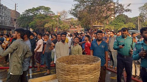 উৎসাহী জনতা সড়কের বিভিন্ন জায়গায় অবস্থান করছে। তাদের সরে যাওয়ার জন্য বলা হরেচ্ছ বারবার। মাইকে ক্রমাগত ঘোষণা দেওয়া হচ্ছে ফায়ার সার্ভিসের কাজে বিঘ্ন সৃষ্টি না করতে।