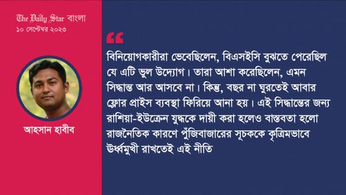 'ফ্লোর প্রাইস' বাংলাদেশের পুঁজিবাজারকে 'আকর্ষণহীন' করে তুলছে বলে মন্তব্য করেছে এইচএসবিসি গ্লোবাল রিসার্চ। কেননা, এটি একটি বিধিনিষেধ। গত মাসে প্রকাশিত প্রতিবেদনে প্রতিষ্ঠানটি জানায়, এই বিধিনিষেধটি বিনিয়োগকারীদের আস্থায় ঘাটতি তৈরি করেছে।