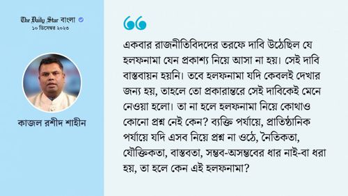 হলফনামা কি কেবলই দেখার জন্য? নাকি দেখার পর প্রশ্নও করা যাবে? এই বাংলায় সে-এক সময় ছিল, যখন রাজনীতির কেন্দ্রে ছিল জনগণ। জনগণের জন্য রাজনীতিবিদরা সর্বস্ব বিলিয়ে দিতেন, এমনকি সাধের জায়গা-জমি, হালের গরু-মহিষ, জমানো টাকা-পয়সা, কেউ কেউ তো ঋণ করেও মানুষের পাশে দাঁড়াতেন। মানুষের কল্যাণ, সমাজের মঙ্গল, দেশের হিতসাধনই ছিল সেসব দিনের রাজনীতিবিদদের ব্রত।
