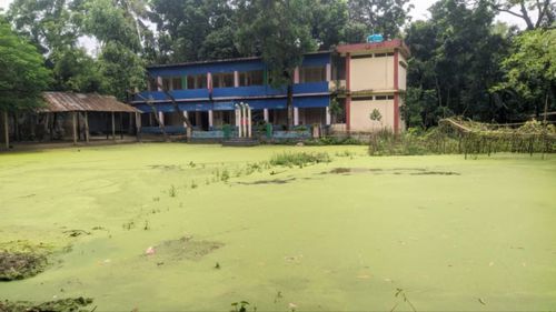 স্কুলের পুরো মাঠে পানি থৈ থৈ। প্রথম দেখায় পুকুর বলে বিভ্রম হয়। এই পরিস্থিতি থাকে বছরের ছয় মাস। এ সময় শিশুরা এখানে খেলতে পারে না।