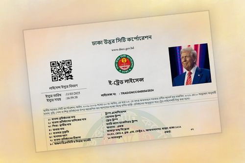 অবাক করার মতো বিষয় হলেও ঘটনা সত্যি! মার্কিন প্রেসিডেন্ট ডোনাল্ড ট্রাম্পের নামে এমনই একটি ভুয়া ট্রেড লাইসেন্স দিয়েছে ডিএনসিসির রাজস্ব বিভাগ। সংস্থাটির দায়িত্বপ্রাপ্ত কর্মকর্তারা এমন ট্রেড লাইসেন্স ইস্যু হওয়ার বিষয়টি নিশ্চিত করেছেন।