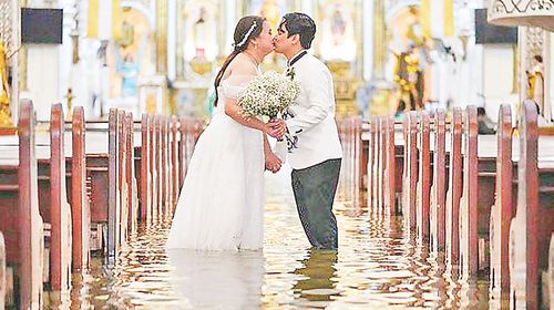 বিয়ের দিন বৃষ্টি-বন্যার আশঙ্কার পূর্বাভাস অবশ্য ওই জুটি আগেই পেয়েছিলেন। চাইলে দিন পেছাতে পারতেন। কিন্তু আবহাওয়ার কারণে বিশেষ দিনটির আনন্দ তাঁরা মলিন হতে দিতে চাননি। তাই বিয়েটা সেরে ফেলার সিদ্ধান্ত নেন তাঁরা। যেমন ভাবা তেমন কাজ। প্লাবিত গির্জার ভেতরই হাঁটুপানিতে দাঁড়িয়ে একে অপরকে জীবনসঙ্গী হিসেবে গ্রহণ করলেন ভারদিলো ও আগুইলার।
