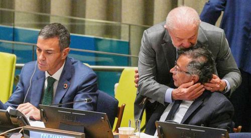 জাতিসংঘের সাধারণ পরিষদে এক দুর্দান্ত সংহতির মুহূর্ত দেখা গেল। কলম্বিয়ার প্রেসিডেন্ট গুস্তাভো পেত্রো গাজায় ইসরায়েলের আগ্রাসন নিয়ে তীব্র ভাষায় বক্তব্য দেওয়ার পর ব্রাজিলের প্রেসিডেন্ট লুইস ইনাসিও লুলা দা সিলভা তাঁকে আলিঙ্গন করেন এবং মাথায় চুমু দেন। ভারতীয় সংবাদমাধ্যম মানি কন্ট্রোলের প্রতিবেদন থেকে এ তথ্য জানা গেছে।