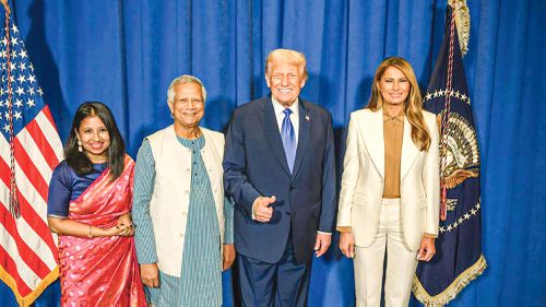 যুক্তরাষ্ট্র সফররত প্রধান উপদেষ্টা ড. মুহাম্মদ ইউনূসের একটা ছবি প্রকাশিত হয়েছে ওনারই ভেরিফায়েড ফেসবুক পেজে। প্রেসিডেন্ট ট্রাম্পের সঙ্গে ছবি। ছবিতে আরও দুজন আছেন, ট্রাম্পের পাশে তাঁর স্ত্রী মেলানিয়া ট্রাম্প এবং ড. ইউনূসের পাশে তাঁর কন্যা দিনা ইউনূস। ঘটনা ২৩ সেপ্টেম্বরের। ২২ সেপ্টেম্বর ড. ইউনূস যুক্তরাষ্ট্রে গেছেন জাতিসংঘের ৮০তম সাধারণ পরিষদের অধিবেশনে যোগ দিতে। এর পরদিনই প্রেসিডেন্ট ট্রাম্প একটা রিসেপশনের আয়োজন করেন বিশ্বনেতাদের জন্য। অনেক দিন ধরেই এটা একটা প্রথার মতো। সেখানে অনেক নেতাই হোস্টের সঙ্গে দাঁড়িয়ে ছবি তুলে থাকেন। আবার ইচ্ছা হলেই বিয়েবাড়ির মতো যে কেউ গিয়ে ছবি তুলতে পারেন, বিষয়টা সে রকমও নয়। যাঁদের ওরা চান, তাঁরাই তুলতে পারেন ছবি।