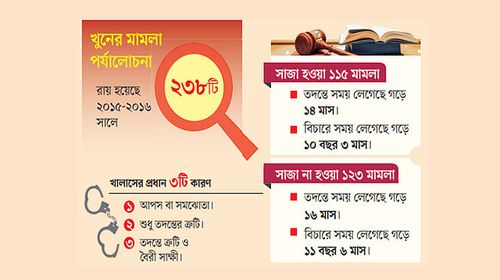 রাজনৈতিক প্রতিপক্ষের হামলা, পারিবারিক বিরোধ, শত্রুতা কিংবা ডাকাতি-ছিনতাই; কারণ যা-ই হোক না কেন, খুনের ঘটনায় করা ৫২ শতাংশ মামলায় আসামিরা খালাস পান। অন্যভাবে বলা যায়, দেশে খুনের ঘটনায় যত মামলা হয়, তার মধ্যে অর্ধেকের বেশি মামলায় শেষ পর্যন্ত আসামিদের কোনো সাজা হয় না।