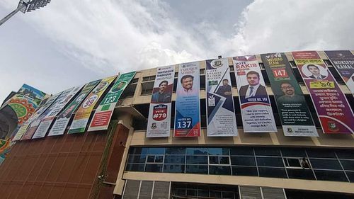 ভবনের চূড়া থেকে ঝুলিয়ে রাখা হয়েছে বিশাল আকারের একেকটি ব্যানার। প্রার্থীরা নিজেদের উপস্থাপন করেছেন চটকদার নানা কথায়। নির্বাচনের আগের দিন এসবই দেখা গেল মিরপুর শের-ই-বাংলা স্টেডিয়ামে। নাজমুল হাসান (পাপন) বোর্ড সভাপতি থাকার সময়ও এমনটি দেখা যেত। নির্বাচনের আগে ব্যানারে ব্যানারে ছেয়ে যেত দেয়াল। বিসিবি যেন রূপ নিত রাজনৈতিক দলের নির্বাচনী অফিসে। মজার ব্যাপার হলো, নির্বাচন হতো স্রেফ দু-একটি পদে। বাকি সব ছিল সাজানো।