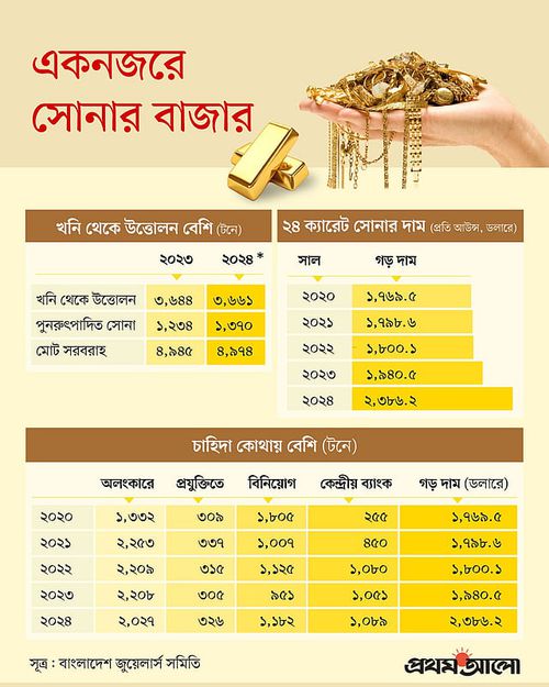 ওয়ার্ল্ড গোল্ড কাউন্সিলের তথ্যানুযায়ী, ২০২৩ সালে বিশ্বে ৪ হাজার ৯৪৬ টন সোনা সরবরাহ করা হয়। গত বছর সেটি বেড়ে হয় ৪ হাজার ৯৭৫ টন। এর মধ্যে খনি থেকে উত্তোলিত হয়ে এসেছে ৩ হাজার ৬৬১ টন সোনা। আর ১ হাজার ৩৭০ টন পুরোনো সোনা পুনরুৎপাদন করে পাওয়া গেছে।