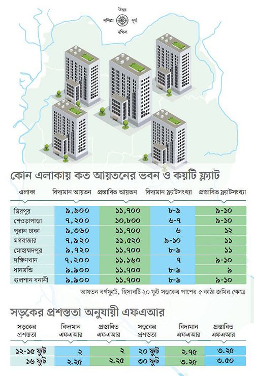 বর্তমানে মগবাজারে ২০ ফুট প্রশস্ত সড়কের পাশের পাঁচ কাঠা জমিতে সর্বোচ্চ ৭ হাজার ৯২০ বর্গফুট আয়তনের ভবন নির্মাণ করা যায়। তবে ভবিষ্যতে একই জমিতে ১১ হাজার ৫২০ বর্গফুটের ভবন নির্মাণের সুযোগ মিলবে। ভবনের আয়তনের মতো ফ্ল্যাট বা ইউনিটের সংখ্যা ৯-১০ থেকে বেড়ে হবে ১১টি।