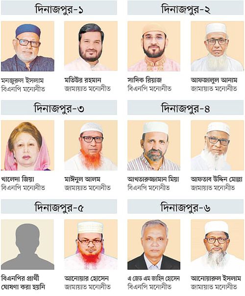 ছয়টি আসনের মধ্যে পাঁচটিতে প্রার্থী দিয়েছে বিএনপি। এর মধ্যে দুটিতে প্রার্থী নিয়ে দলের একাংশের মধ্যে অসন্তোষ রয়েছে। সদরে মনোনয়ন নিয়ে নেতাদের মধ্যে বিভেদ থাকলেও বিএনপির চেয়ারপারসন খালেদা জিয়াকে প্রার্থী ঘোষণা করায় তাঁরা এককাট্টা হয়েছেন। অন্যদিকে অনেক আগে থেকে মাঠে রয়েছে জামায়াত।