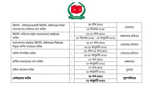 মনোনয়নপত্র বাছাইয়ে রিটার্নিং অফিসারের সিদ্ধান্তের বিরুদ্ধে আপিল দাখিলের তারিখ ৫ থেকে ১১ জানুয়ারি।