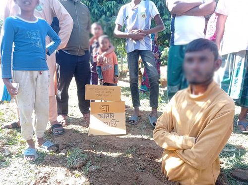 অর্ধেক শরীর মাটিতে পোঁতা যুবকের, পাশে লেখা ‘মা মারার শাস্তি’