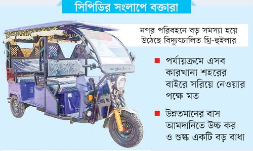 ঢাকা শহরের পরিবেশ রক্ষা ও যানজট নিরসনে বিদ্যুত্চালিত থ্রি-হুইলারের অনিয়ন্ত্রিত বিস্তার বড় চ্যালেঞ্জ হয়ে দাঁড়িয়েছে। শুরু থেকেই উৎপাদন ও ব্যবহারে কার্যকর নিয়ন্ত্রণ না থাকায় এই যানবাহন এখন নগর পরিবহনব্যবস্থার জন্য একটি বড় সমস্যায় পরিণত হয়েছে বলে মন্তব্য করেছেন বিশেষজ্ঞরা। তাঁদের মতে, বিদ্যুত্চালিত থ্রি-হুইলার নিয়ন্ত্রণ করতে হলে আগে অনিয়ন্ত্রিত উৎপাদন কারখানাগুলো বন্ধ করা জরুরি। তবে সরাসরি বন্ধের পরিবর্তে পর্যায়ক্রমে এসব কারখানা শহরের বাইরে সরিয়ে নেওয়ার পক্ষে মত দিয়েছেন অনেকে।