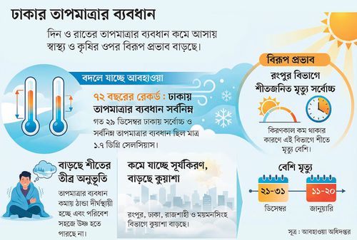 বিদায়ী ডিসেম্বর মাসের একটি দিনে ঢাকার সর্বোচ্চ ও সর্বনিম্ন তাপমাত্রার ব্যবধান ৭২ বছরের মধ্যে সবচেয়ে কম দেখা গেছে। রাজধানীতে দিন-রাতের তাপমাত্রার গড় ব্যবধান বেশি মাত্রায় কমছে প্রায় এক দশক ধরে। শুধু ঢাকা নয়, দেশের অন্যান্য অঞ্চলের চিত্রও প্রায় একই রকম—বলছেন বিশেষজ্ঞরা।