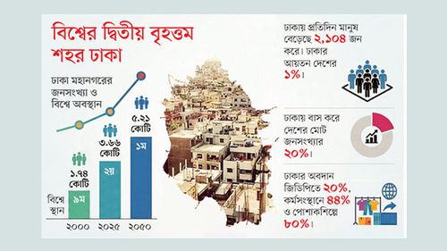ঢাকার এই বিশালত্ব নিয়ে আলোচনা কম হয়। জাতিসংঘ মনে করছে, দুটি মহানগরে আগামী ২৫ বছর জনসংখ্যা ৫ শতাংশ হারে বাড়বে। এর একটি ঢাকা, অন্যটি সাংহাই। ঢাকা যেভাবে বাড়ছে, তার সঙ্গে তাল মেলাতে পারছেন না বাংলাদেশের নীতিনির্ধারকেরা।