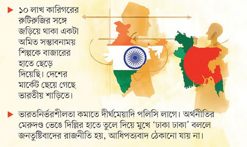 ভারত নিজেদের ‘হ্যান্ডলুম’ ইন্ডাস্ট্রি টিকিয়ে রাখতে দীর্ঘ মেয়াদে বিনিয়োগ করেছে, প্রণোদনা দিয়েছে, প্রযুক্তি আধুনিকায়নে সহজ শর্তে ঋণ দিয়েছে। আর আমরা কী করেছি? ১০ লাখ কারিগরের রুটিরুজির সঙ্গে জড়িয়ে থাকা একটা অমিত সম্ভাবনাময় শিল্পকে বাজারের হাতে ছেড়ে দিয়েছি। দেশের মার্কেট ছেয়ে গেছে ভারতীয় শাড়িতে। কয়েক দশকের সুনিপুণ কারুকার্যের দক্ষতা নিয়ে ৭ লাখ তাঁতি কাজ হারিয়েছেন, কেউ হকারি করছেন, কেউ অটোরিকশা কিনেছেন।