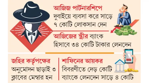 তার স্ত্রীর বিও অ্যাকাউন্ট ও ব্যাংকে ৩৪ কোটি টাকার লেনদেন হয়েছে। দুর্নীতি দমন কমিশনে (দুদক) আজিজুর রহমানের বিরুদ্ধে অভিযোগ জমা পড়েছে। শুধু আজিজুর রহমানই নন, তিনিসহ ১৩ জন কর্মকর্তার বিরুদ্ধে ক্ষমতার অপব্যবহার, অনিয়ম ও দুর্নীতির মাধ্যমে সম্পদ অর্জনের অভিযোগ উঠেছে। গেল বছরের ডিসেম্বরের মাঝামাঝি দুদক অভিযোগের অনুসন্ধানে নামে। দুদকের একাধিক কর্মকর্তা অভিযোগের অনুসন্ধান করছেন বলে জানা গেছে।