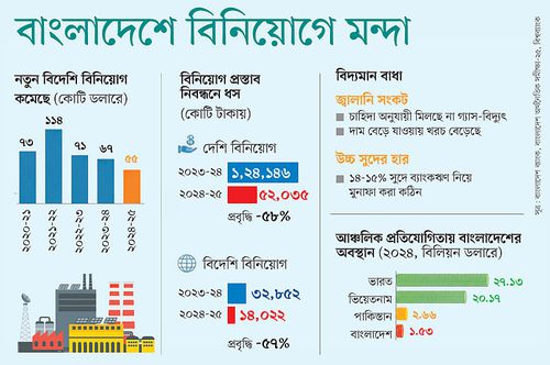 দেশে ২০২৩-২৪ অর্থবছর জিডিপির অনুপাতে বেসরকারি খাতের বিনিয়োগের হার ছিল ২৩ দশমিক ৫১ শতাংশ। বিগত ২০২৪–২৫ অর্থবছরে সেটি কমে ২২ দশমিক ৪৮ শতাংশে নেমেছে। সে বছরে মূলধনি যন্ত্রপাতি আমদানি হয়েছিল ২৮১ কোটি ডলারের, যা কিনা আগের বছরের তুলনায় ১৯ শতাংশ কম। বেসরকারি খাতের ঋণপ্রবাহও ছয় মাস ধরে ৭ শতাংশের নিচে। অথচ ক্ষমতাচ্যুত সরকারের শেষ মাসেও এ ক্ষেত্রে প্রবৃদ্ধি ছিল ১০ শতাংশের বেশি।