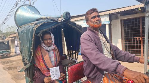 অটোরিকশার হুড থেকে ঝালর খসে পড়ছে। দেখে মনে হচ্ছে ভাঙা ঘরের চালা। তার ভেতর থেকে একজন নারী করুণ দৃষ্টিতে বাইরে চেয়ে আছেন। পথচারী দেখলে তাঁর হাতে ফুটবল প্রতীকের একটি প্রচারপত্র দিয়ে ভোট চাচ্ছেন। তাঁর সঙ্গে আর কেউ নেই।