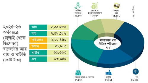 রাজস্ব বাবদ চলতি ২০২৫-২৬ অর্থবছরের প্রথমার্ধে (জুলাই-ডিসেম্বর) প্রায় ২ লাখ ২৩ হাজার কোটি টাকা আয় হয়েছে সরকারের। যদিও পরিচালন ও উন্নয়ন খাত মিলিয়ে এ সময়ে আড়াই লাখ কোটি টাকারও বেশি ব্যয় হয়েছে।