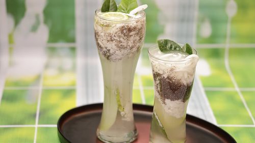 চিয়া সিডস ১ কাপ পানি ও ১ টেবিল চামচ চিনির সিরা দিয়ে মিশিয়ে নিন। ডাব ভেঙে শাঁস লম্বা করে ছাড়িয়ে নিন। ডাবের পানিটা আলাদা রাখুন। এবার আধা কাপ ডাবের পানির সঙ্গে অর্ধেক পরিমাণ ডাবের শাঁস ও ১ টেবিল চামচ চিনির সিরা ব্লেন্ড করে নিন। গ্লাসে প্রথমে লেবুপাতা, আইস কিউব, ১ টেবিল চামচ সিরাপ ঢেলে দিন। তারপরে চিয়া সিডস ও ডাবের শাঁসের টুকরা দিন। সবশেষে ডাবের পানি ঢেলে দিন। ওপরে লেবু স্লাইস ও পুদিনাপাতা দিয়ে সাজিয়ে পরিবেশন করুন। চিনির সিরা স্বাদ অনুযায়ী কমাতে ও বাড়াতে পারেন।