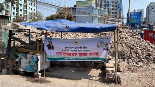 সেই ধ্বংসস্তূপের সামনে রাতে কে বা কারা ‘আওয়ামী লীগ রাজশাহী মহানগর শাখা কার্যালয় শুভ উদ্বোধন করা হলো’ লেখা একটি ব্যানার টানিয়ে দেয়। সকালে বিষয়টি জানাজানি হলে দুপুর সাড়ে ১২টার দিকে সেখানে যান স্বেচ্ছাসেবক দলের নেতাকর্মীরা।