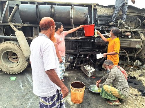 দুর্ঘটনার পর স্থানীয় লোকজন ঘটনাস্থলে ভিড় করেন। তাঁদের মধ্যে কয়েকজন তেলের ট্যাংক থেকে ঝরতে থাকা ডিজেল বালতি, পলিথিন ও বিভিন্ন পাত্রে সংগ্রহ করে নিয়ে যান। এ দৃশ্য দেখে শুভুল্যা গ্রামের বাসচালক রুবেল মিয়া দ্রুত ঘটনাস্থলে ছুটে আসেন। তিনি একটি লৌহদণ্ড দিয়ে ট্যাংকের মুচড়ে যাওয়া অংশ সোজা করার চেষ্টা করেন এবং পরে সাবান ব্যবহার করে তেল পড়া বন্ধ করার চেষ্টা করেন। এতে কিছুটা সফলতাও পান তিনি।