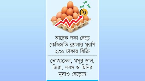 এদিকে সরকারি সংস্থা ট্রেডিং করপোরেশন অব বাংলাদেশের (টিসিবি) দৈনিক পণ্যমূল্যের তালিকা পর্যালোচনা করে দেখা গেছে, এ দিন রাজধানীর খুচরা বাজারে প্রতি হালি ফার্মের ডিম বিক্রি হচ্ছে মানভেদে ৩৬-৪০ টাকা। আগের দিন ৩২ থেকে ৪০ টাকায় বিক্রি হয়েছে। এছাড়া খুচরা বাজার ঘুরে বিক্রেতাদের সঙ্গে কথা বলে জানা যায়, এদিন প্রতি কেজি ব্রয়লার মুরগি বিক্রি হচ্ছে ২৩০ টাকা, যা এক দিন আগেও ২২০ টাকায় বিক্রি হয়েছে। এক সপ্তাহ আগে ১৮০-১৯০ এবং এক মাস আগে ১৭০-১৮০ টাকায় বিক্রি হয়েছে।