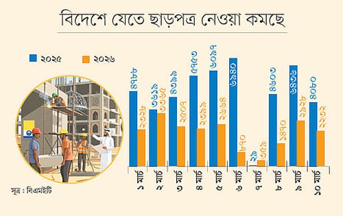 মধ্যপ্রাচ্যে যুদ্ধের মধ্যে গত বছরের তুলনায় এই সময়ে কাজের জন্য বিদেশ যাওয়া কমেছে। বাংলাদেশ জনশক্তি, কর্মসংস্থান ও প্রশিক্ষণ ব্যুরোর (বিএমইটি) তথ্য বলছে, চলতি মার্চ মাসের প্রথম ১০ দিনে গত বছরের একই সময়ের তুলনায় বিদেশে যেতে ছাড়পত্র নেওয়া কমেছে প্রায় ৫০ শতাংশ।