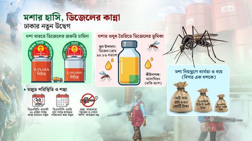 কীটনাশক সরবরাহকারীরা জানিয়েছেন, মশক নিধনে ব্যবহৃত ওষুধের সঙ্গে মেশানোর জন্য প্রয়োজনীয় ডিজেল বাজারে পাওয়া যাচ্ছে না। পরিস্থিতি এমন পর্যায়ে পৌঁছেছে যে, ডিজেল সংকটে ফগিংয়ের ধোঁয়া বন্ধ হলে মশার উপদ্রব কল্পনাতীতভাবে বেড়ে যেতে পারে। ভুক্তভোগী অনেকেই রসিকতা করে বলছেন, সামনে হয়তো মশার ‘স্বর্ণযুগ’ আসছে, যেখানে তারা নির্বিঘ্নে মানুষকে কামড়ানোর উৎসব করবে!