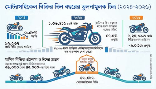 খাতসংশ্লিষ্ট বিভিন্ন প্রতিষ্ঠানের তথ্য অনুযায়ী, দেশে ঈদুল ফিতর উপলক্ষে ২০২৫ সালের মার্চ মাসে মোটরসাইকেল বিক্রি হয়েছিল ৫৬ হাজার ৪৮৬টি। চলতি ২০২৬ সালেও মার্চে ঈদ হয়। এ মাসে মোটরসাইকেল বিক্রি হয়েছে ৫১ হাজার ৯৫৮টি, যা গত বছরের চেয়ে ৪ হাজার ৫২৮টি বা ৮ শতাংশ কম।