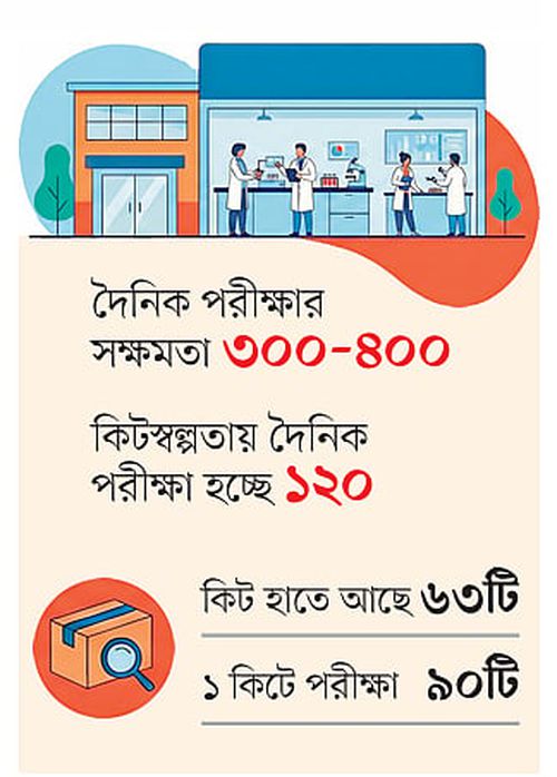 গতকাল রোববার জনস্বাস্থ্য ইনস্টিটিউটের কর্মকর্তা-কর্মচারীদের সঙ্গে কথা বলে জানা যায়, হাম পরীক্ষার কিট দেয় বিশ্ব স্বাস্থ্য সংস্থা। একটি কিটে ৯০ জন রোগীর নমুনা পরীক্ষা করা যায়। গতকাল দুপুরে তাঁদের কাছে কিট ছিল মাত্র তিনটি। সন্ধ্যায় ৬০টি কিট দিয়েছে বিশ্ব স্বাস্থ্য সংস্থা। এ ছাড়া ঢাকার শাহজালাল বিমানবন্দরে কিছু কিট এসেছে। কাগজপত্রের জটিলতায় এগুলো এখনো ছাড় হয়নি।