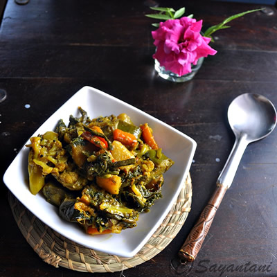 সব ধরনের সবজি (গাজর, পেঁপে, বেগুন, আলু, চিচিঙ্গা) তিন কাপ, তেজপাতা দুটি, লেবুপাতা একটি, পাঁচফোড়ন দুই চা চামচ, ঘি চার ভাগের এক কাপ, আদা বাটা দুই চা চামচ, শুকনা মরিচ তিন থেকে চারটি, হলুদ গুঁড়া এক চা চামচ, ধনে গুঁড়া এক চা চামচ, জিরা গুঁড়া এক চা চামচ, চিনি এক চা চামচ ও লবণ স্বাদমতো। যেভাবে করবেন :- -কড়াইতে ঘি গরম করে পাঁচফোড়ন ও শুকনা মরিচের ফোড়ন, তেজপাতা ও আদা বাটা দিয়ে নেড়ে বাকি সব গুঁড়া মশলা ও সবজিসহ কষিয়ে সামান্য পানি দিয়ে (সাত থেকে আট মিনিট) ঢেকে রাখুন।
